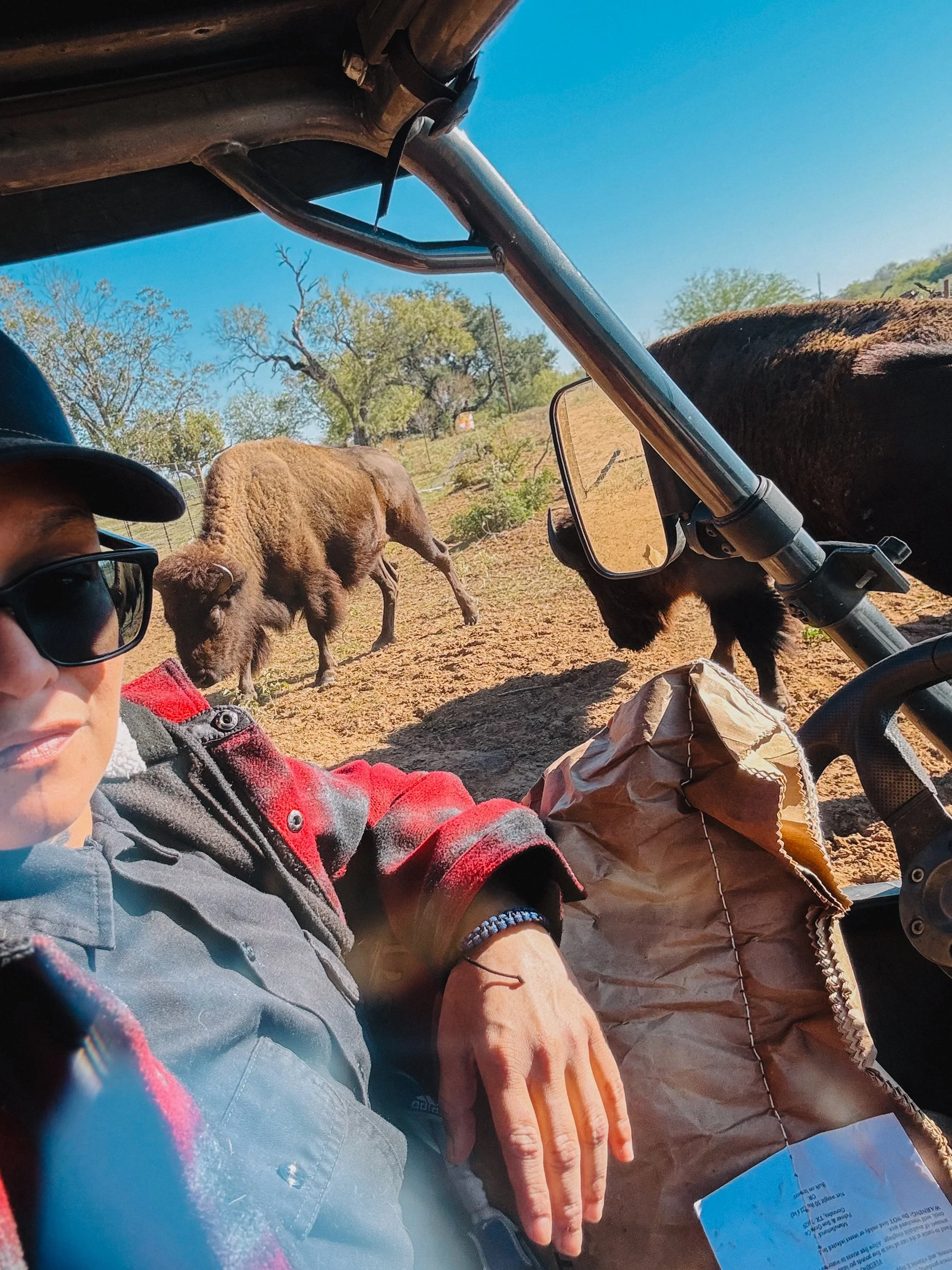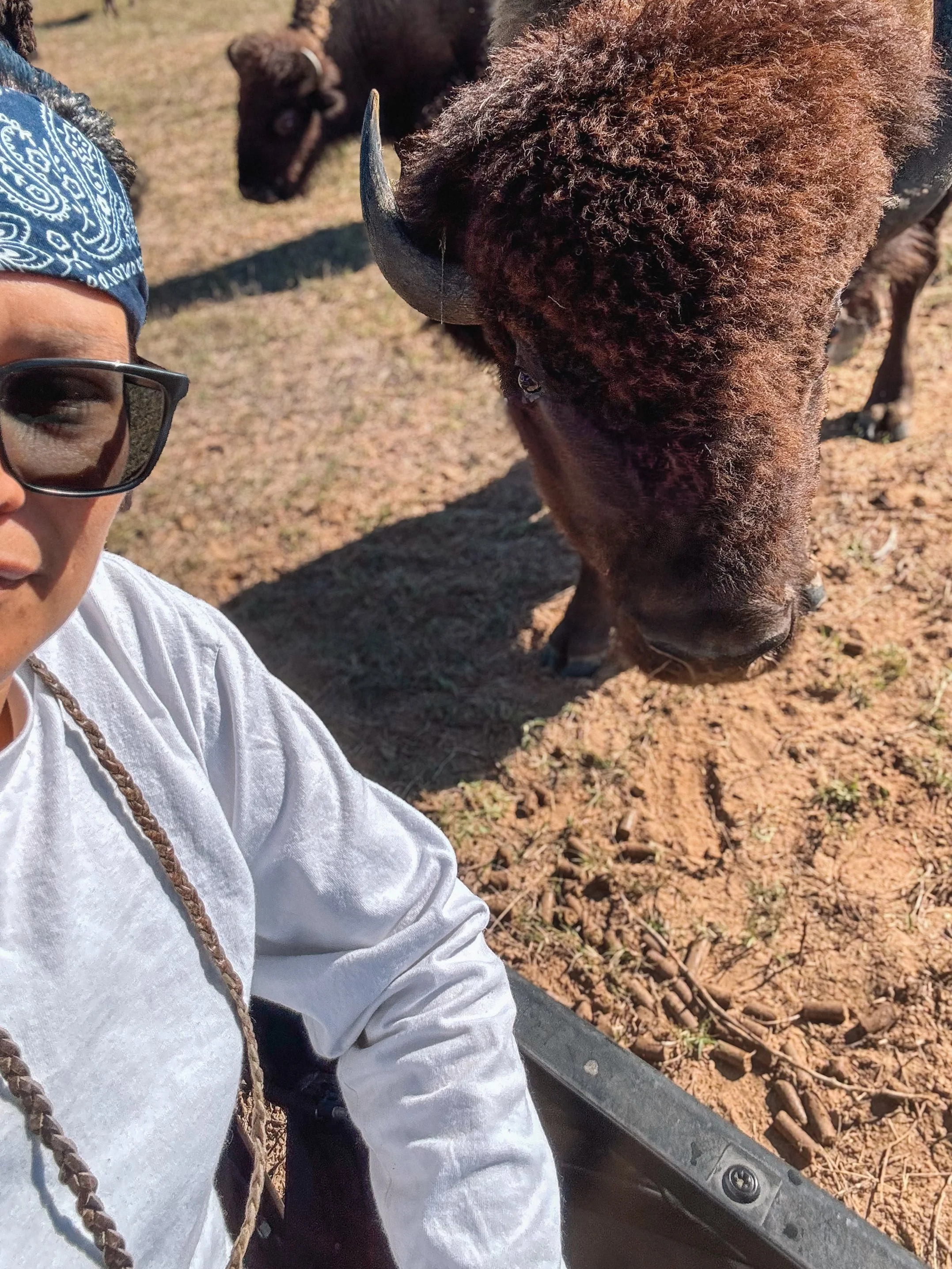 A: My relationship to the land is ancestral and spiritual. As Karankawa, Lipan Apache, and Mexica descendant, the land is more than a resource—it is kin, memory, and guidance. The buffalo hold a powerful spiritual presence for me. They carry teachings of endurance, purpose, and balance. Being near them feels like standing in the presence of my ancestors. They remind me of who I am, the people I come from, and the responsibilities I hold to walk gently, truthfully, and with strength.