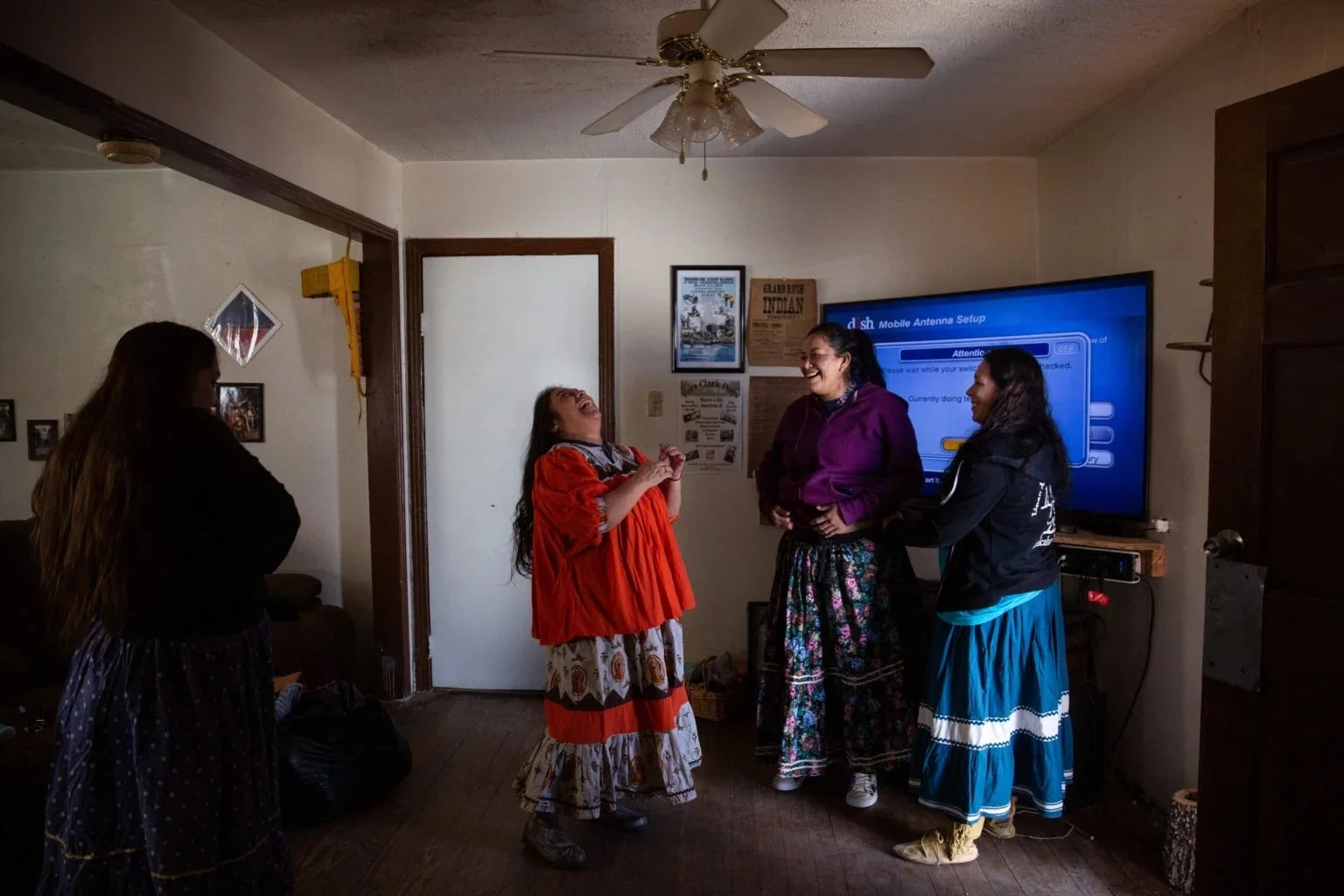 When he was a kid, there was no Apache culture evident at family gatherings. But at their gathering today, women wear Apache dresses and the boys beat homemade drums, tanned hides stretched over kitchen pots. A White Mountain Apache man named Shawn from an Arizona reservation had married into the family. Each month for a year now, he has built a sweat lodge and led prayers in his Apache language. Fifteen boys and men aged 12 to 65 sing Apache songs they’ve practiced for these gatherings. Later, they break for tacos as a remix of Selena’s Tejana cumbia plays over a loudspeaker.